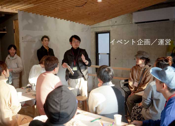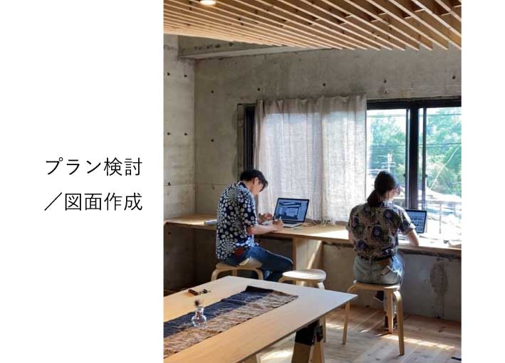 建築設計のプラン検討、図面作成実務、現場監理、現場管理、施工現場手伝い、イベント企画、イベント運営、視察、お施主さんとご飯を共にし、ときには畑を耕します