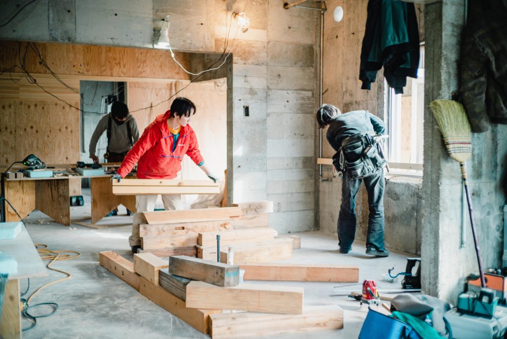 カウンターテーブルの脚は、建物の柱をリメイク